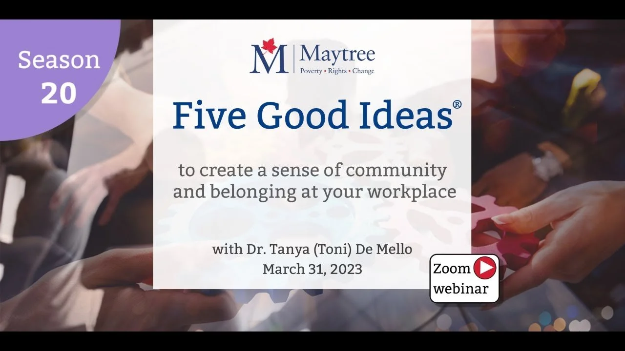 In this Five Good Ideas session, Dr. Tanya (Toni) De Mello, VP Equity and Community Inclusion at Toronto Metropolitan University, explores the ways in which feeling like you belong, knowing that you will be included, and seeing your work community as “your” community matters.